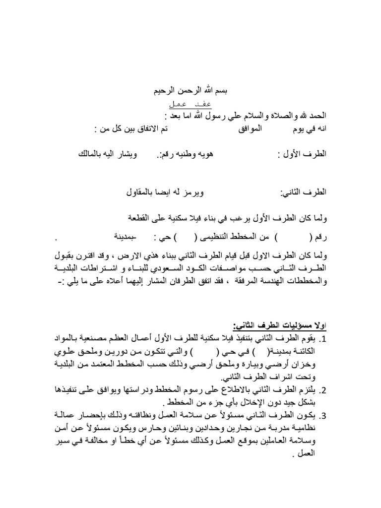 عقد مقاولة نموذج عقد اتفاق بين طرفين