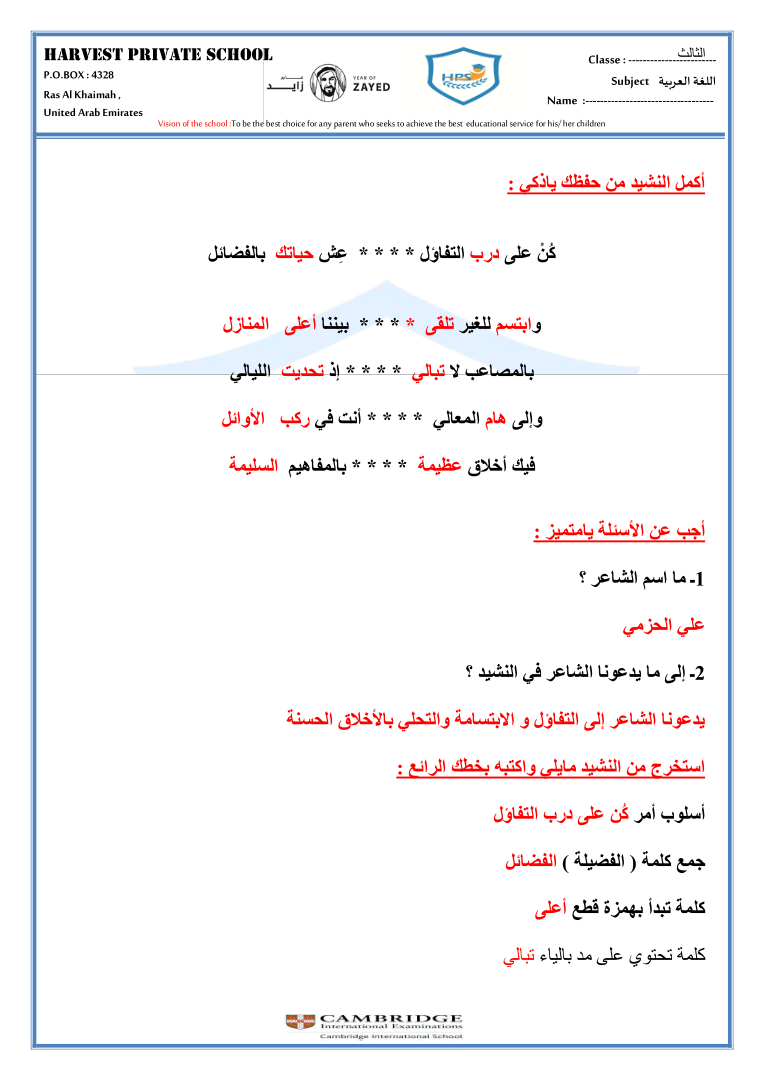 ورقة عمل درس نشيد التفاؤل في اللغة العربية الصف الثالث العلوم والتكنولوجيا